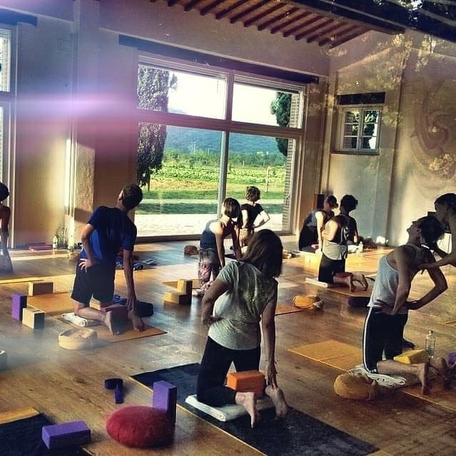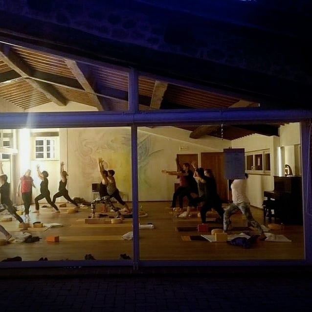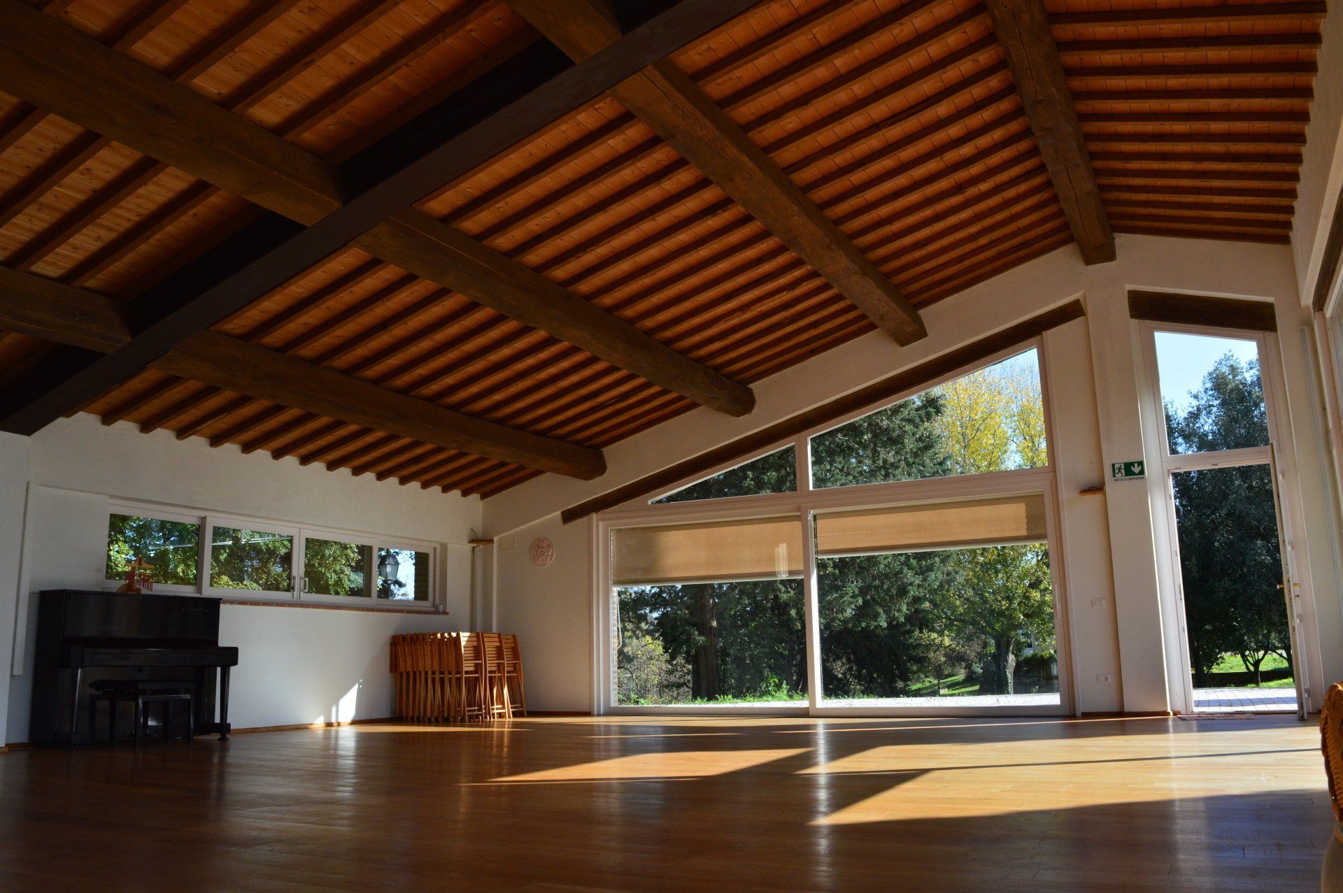 The yoga shala is in a separate building, a spacious and light-full room with wooden floor.